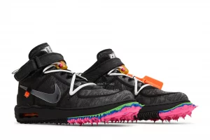 The Nike Air Force 1 Mid Off-White honors the 40th Anniversary of the Nike Air Force 1 by refreshing the classic design with Abloh’s signature avante-garde style. It arrives with a black, wood grain-textured lightweight mesh upper with ripstop collar straps and clear TPU Swooshes. From there, a warped midsole with multi-colored sections of a track-inspired spiked outsole reference past Nike Off-White designs like the Nike Waffle Racer and Air Zoom Tempo Next%.