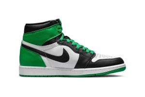 The Air Jordan 1 Retro High OG is constructed using a leather upper, brought to life with shades of white, black and Lucky Green throughout. Lucky Green Nike branding sits on top of the black tongue and insoles of the sneaker. The sneakers are tied together with Lucky Green laces.