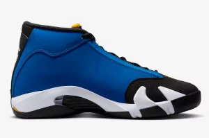 The Laney colorway features Varsity Royal predominantly with accents Varsity Maize, black and white. The shoe’s upper is dressed in Varsity Royal suede, while Varsity Maize accents can be seen on the Jumpman branding, tongue, and heel. Black details include the outsole, heel tab, and inner lining, while white covers the midsole. It also maintains some signature features of the Jordan 14 model, such as the molded heel counter, padded collar, and the dual Zoom Air units in the forefoot and heel.