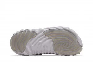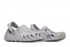 The Crocs Pollex Clog Salehe Bembury Urchin arrives in a light purple, exo-skeletal look with dramatic, fingerprint-like concave ridges throughout its foam construction. While there aren’t as many ventilation holes in this design compared to traditional Crocs Clogs, the remaining holes are located on high-heat areas of the foot for increased breathability. A removable canvas strap at the ankle provides wearers with an option for a more-secure fit.