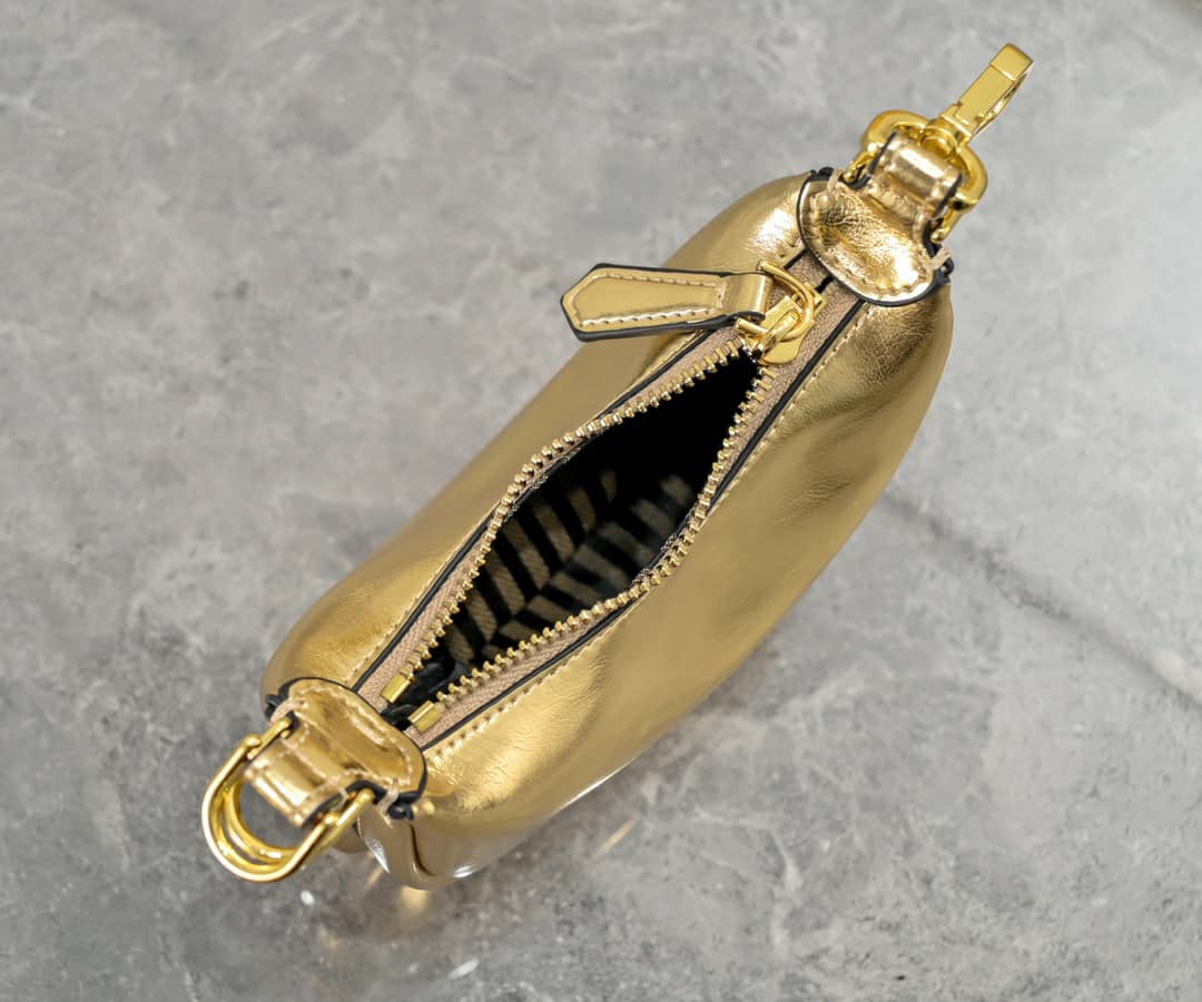 - Zipper closure with fabric-lined internal compartment, gold-finish metalware.