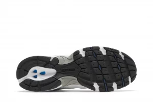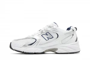 The New Balance 530 White Silver Navy features a white mesh upper with metallic silver and white leather overlays. On the quarter panel, a grey New Balance logo outlined in navy adds contrast. From there, a white and grey ABZORB sole adds the finishing touch.