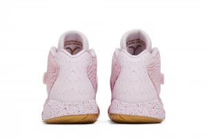 The Nike KD 14 Aunt Pearl has a Gum rubber outsole, as well as a vibrant pink base that features a detailed pattern. Towards the front of the shoe, you will find a hot pink speckled pattern. Across the pink laces and tongue, there is a pink strap that features the iconic Nike Swoosh symbol.